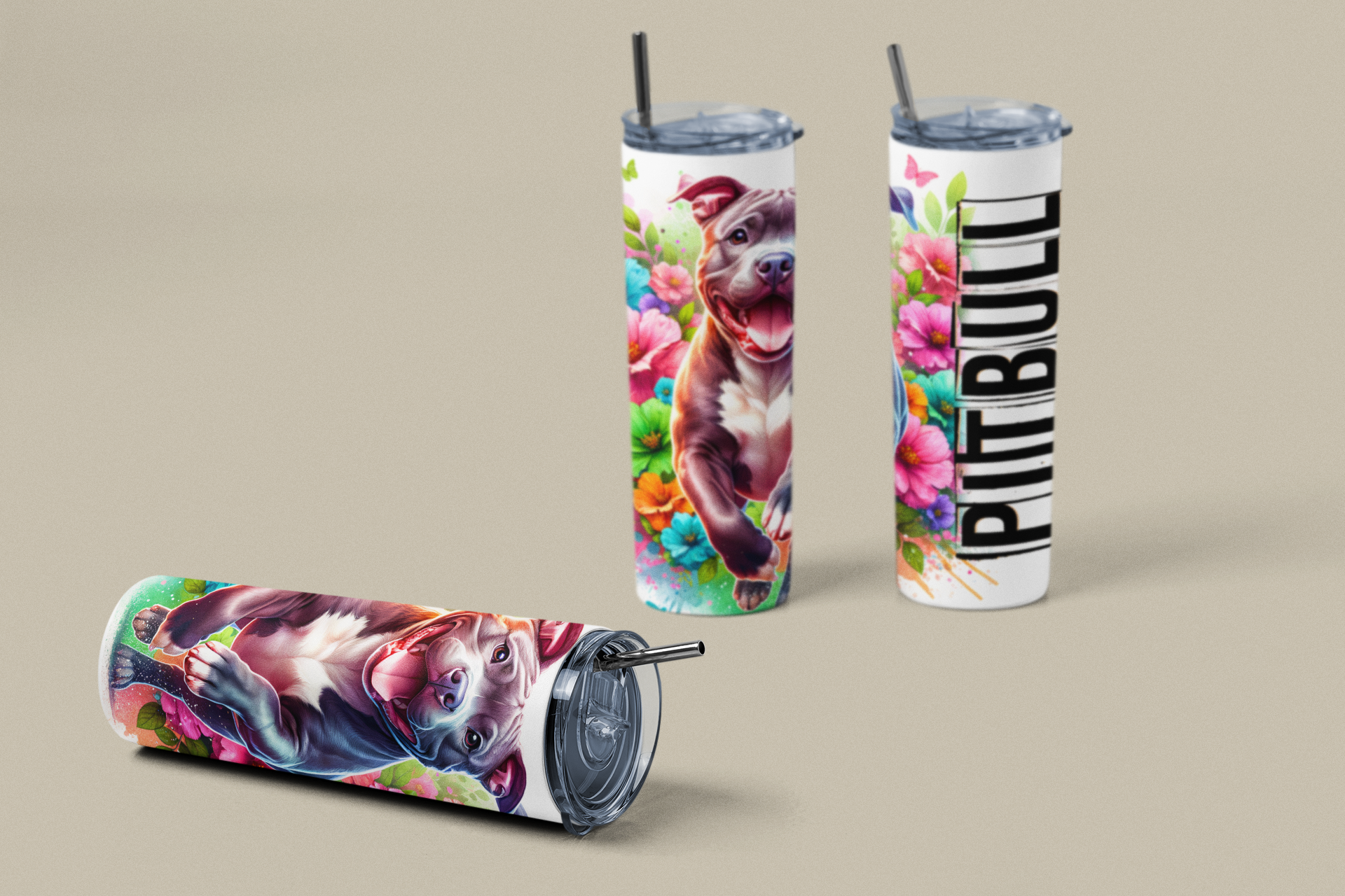 Mit einem fröhlich strahlenden Pitbull, eingerahmt von leuchtenden Blumen und frischen Farben, ist dieser Becher der perfekte Begleiter für alle, die Hunde lieben – besonders diese sanften Kraftpakete mit Herz.