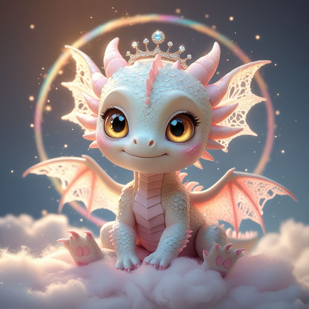 Design: Magischer Baby-Drache mit Krone auf Wolkenhintergrund