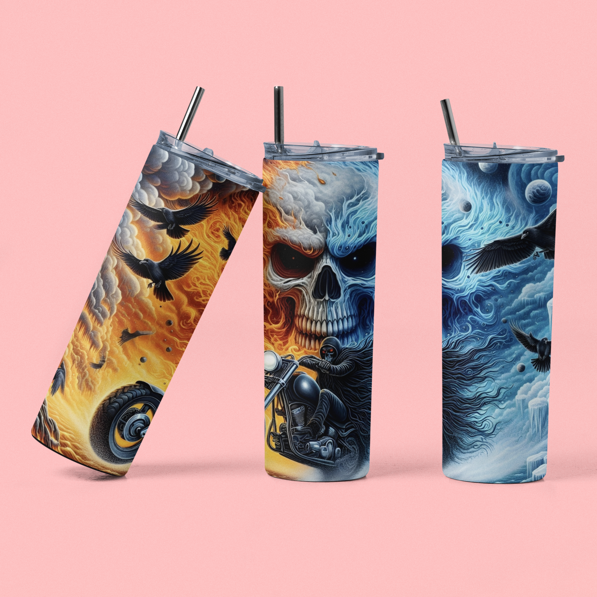 Unser hochwertiger Edelstahl-Tumbler mit düster-epischem Skull-Motiv ist gemacht für starke Charaktere, Biker-Seelen und alle, die das Extreme lieben. Feuer trifft Eis, Totenschädel trifft Maschine – ein Design, das nicht nur auffällt, sondern Geschichten erzählt.