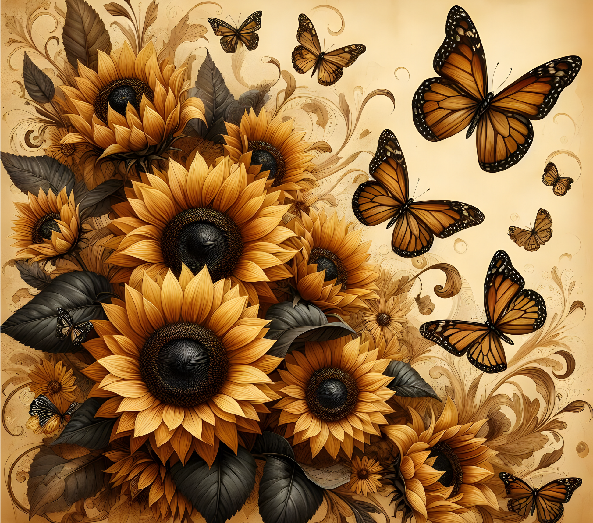 Das warme Sonnenblumen-Design, kombiniert mit detailreichen Schmetterlingen in sanften Herbstfarben, macht ihn zum perfekten Begleiter für gemütliche Tage und verleiht deinem Getränk eine stilvolle Note.