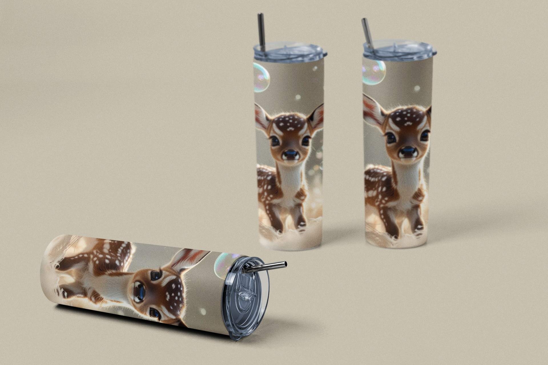 Dieser bezaubernde Tumbler mit Rehkitz-Motiv bringt dir pure Niedlichkeit direkt in die Hand. Das liebevolle Design mit sanften Farben, verträumten Lichtreflexen und schwebenden Seifenblasen lässt nicht nur Kinderherzen höherschlagen.